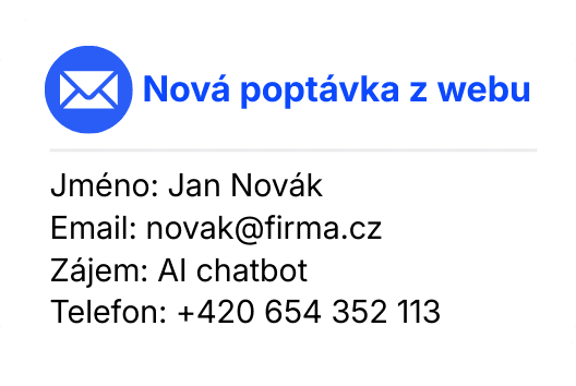 Nasazení uděláme za vás. Chatbot odpovídá 24/7, kvalifikuje zájemce a pošle vám hotové poptávky do e-mailu